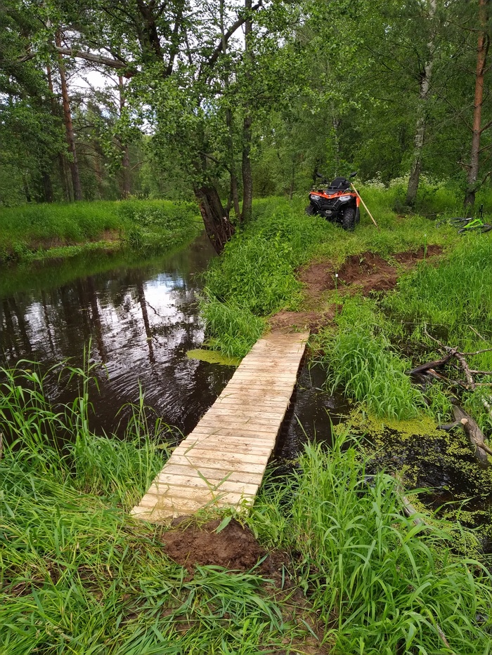 К мостику вёл небольшой техничный участок проложенный прямо по траве нехоженной. У мостика встретил организаторов, которые только только его закончили. Я провел испытательный проезд. Мог и убраться кстати.