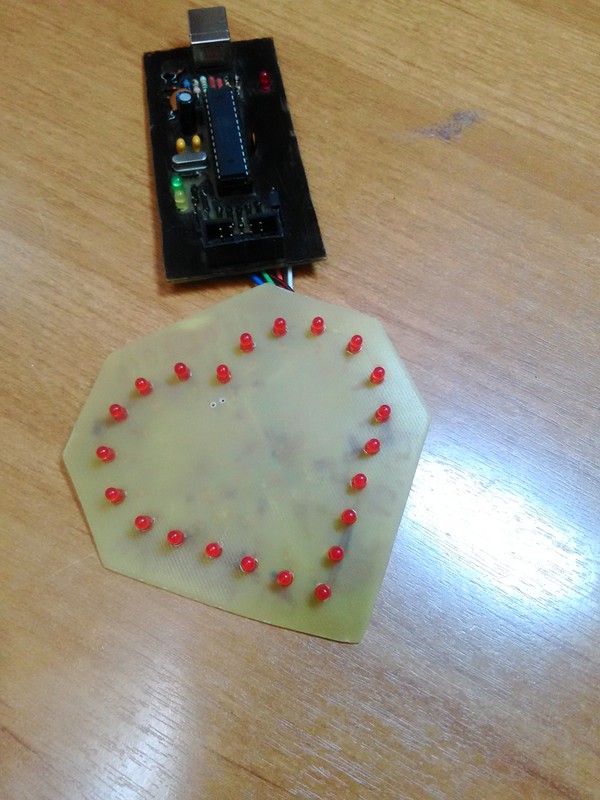 Плата с уже распаянными элементами и подпаянным программатором для программирования и отладки. Вы можете запрограммировать ATmega8 в компьютерных сервисах за символическую плату. Писал программу в Eclipse, к которому прикрутил AVR-GCC.