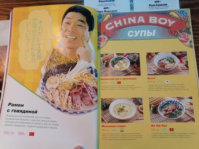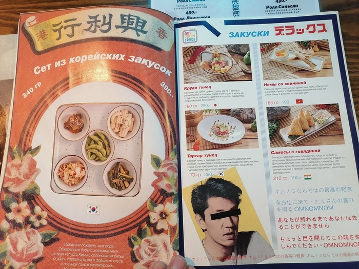 Вот кстати вам пример очень клевого меню, я был настолько в восторге от оформления что отфотал его себе. Когда речь заходит об азиатских меню все стремятся сделать вырвиглазную азиатский дизайн. Это меню в стиле полиграфии 80-х с крупнозерновой точкой и кучей образов из того времени было настолько хорошо, что я не удержался. На пикабу недоступны галереи изображений поэтому чтобы ничего не треснуло от контента, я выложу только пару страниц. Это ли не эстетическое дизайнерское счастье?