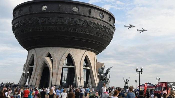 На второй день пребывания в Казани было решено посетить авиашоу. Мероприятие удалось на славу - его открыли парашютисты, спустившиеся с развевающимися флагами в центр смотровой площадки мероприятия - огромного Казана. Вообще этот здоровенный памятник семье стоит на береговой линии прочно вписан в один из символов города. Там собралась огромная толпа, лезть в нее не было никакого желания, поэтому мы наблюдали полеты с возвышенностей противоположного берега.