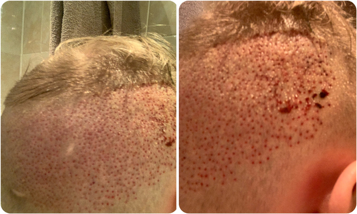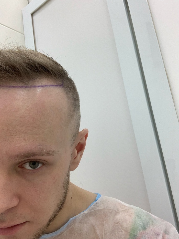 В день операции мне сделали пометки головы куда будет проводиться пересадка и откуда будет проходить извлечение. Я выглядел следующим образом