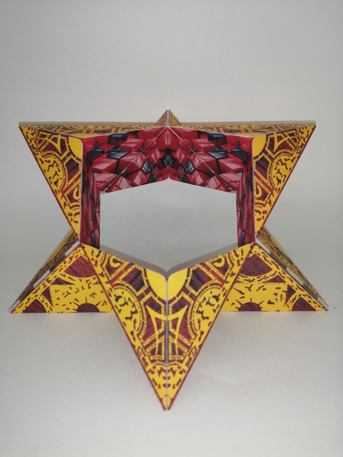 Всего на данный момент, я разработал четыре дизайна, и ещё несколько промежуточных. Самый популярный из них - Шкатулка Лемаршана: мне удалось спарсить из разных источников и натянуть на заготовку дизайн демонического артефакта из фильма "Восставшие из Ада". Затея вышла более чем удачной, в фильме дьявольский куб тоже трансформировался во-всякое, как и идея моей игрушки.