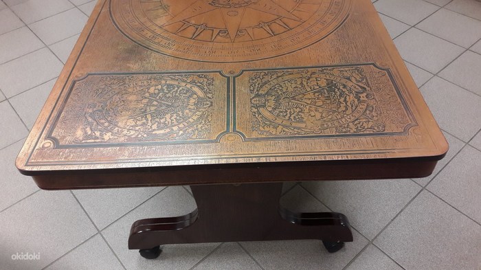 Предыстория такова, что на распродаже я нашёл фантастически атмосферный стол у которого на столешнице выполнен медный рисунок. Стол немного потёрт, но это не страшно и даже придаёт ему некий шарм.