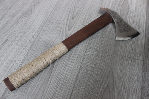 Затем полировка. Топорище покрыл морилкой. Результат мне не понравился. Хотел уже было переделывать, но решил сначала попробовать обмотать льняным жгутом. Стало намного лучше, решил так и оставить. вот собственно, что получилось
