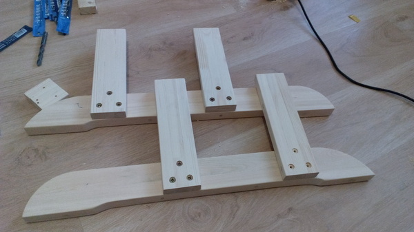 Далее на глаз разметил контуры циркулем и поехал лобзиком выпиливать. Все бруски склеены из брусков 22*22, а стойки, которые справа из двух брусков 30*40