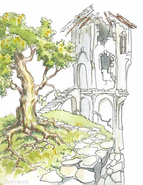 Вернемся к картинке в начале поста - это тренировка, мой вариант иллюстрации и, одновременно, отработка другой техники. С одной стороны, это то, что я люблю - линии и заливка цветом. С другой стороны, в оригинале явно не акварель, да и копировать чужую картинку один в один не спортивно и, имхо, неуважительно. Поэтому какие-то элементы стиля заимствованы (как и сюжет, чего уж там), какие-то нет, что-то переосмыслено.