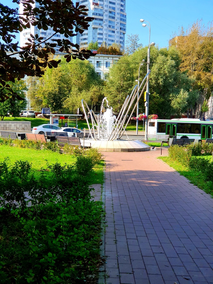 Вдоль Коршунихи проходим до Севастопольского проспекта и небольшого сквера с фонтаном чуть выше начала открытого течения реки (точка 3).