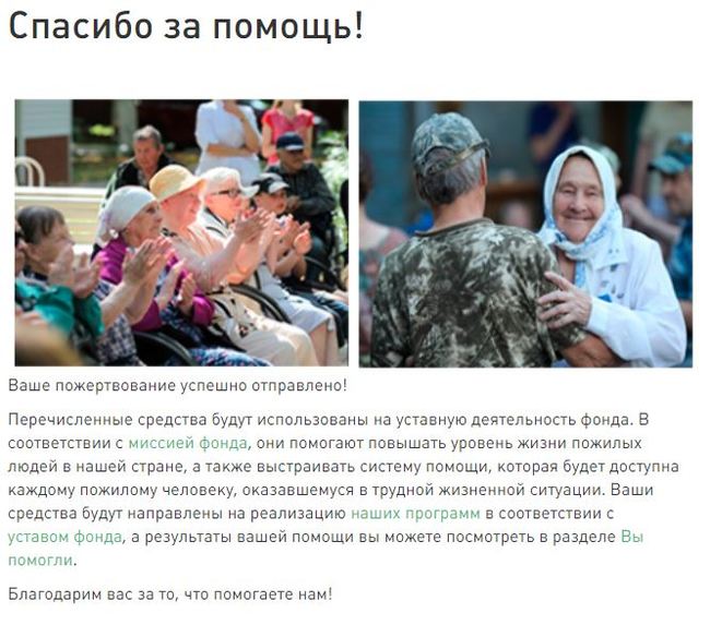 Поэтому мы переслали возвращённую сумму в фонд помощи пожилым людям (он первый в поисковых запросах на Яндексе и Гугле, о нём пишут на РБК, и отчётность на сайте представлена подробно ).