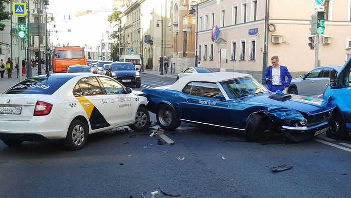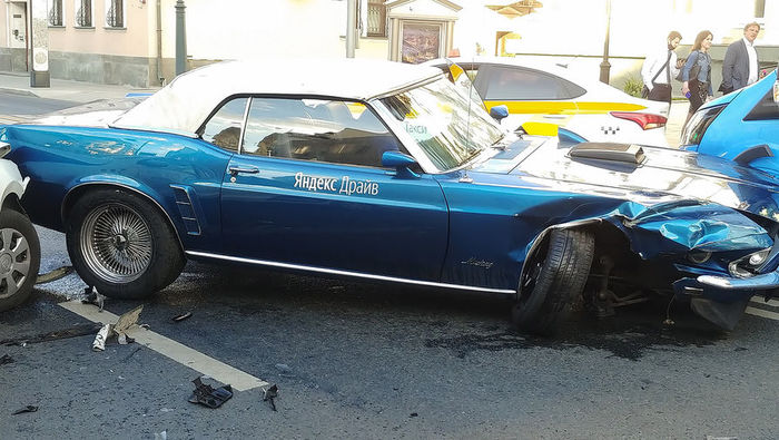 В центре Москвы на улице Остоженка произошло массовое ДТП с участием автомобиля Ford Mustang 1969 года выпуска каршеринговой службы «Яндекс.Драйв», автомобиля такси и фургона. В результате столкновения раритетный кабриолет получил серьезные повреждения. Причина аварии уточняется.