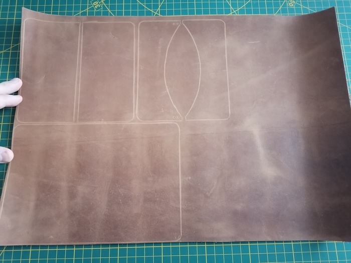 Перенес всё на кожу, обвел шилом, остался небольшой кусок кожи (думаю сделать картхолдер).