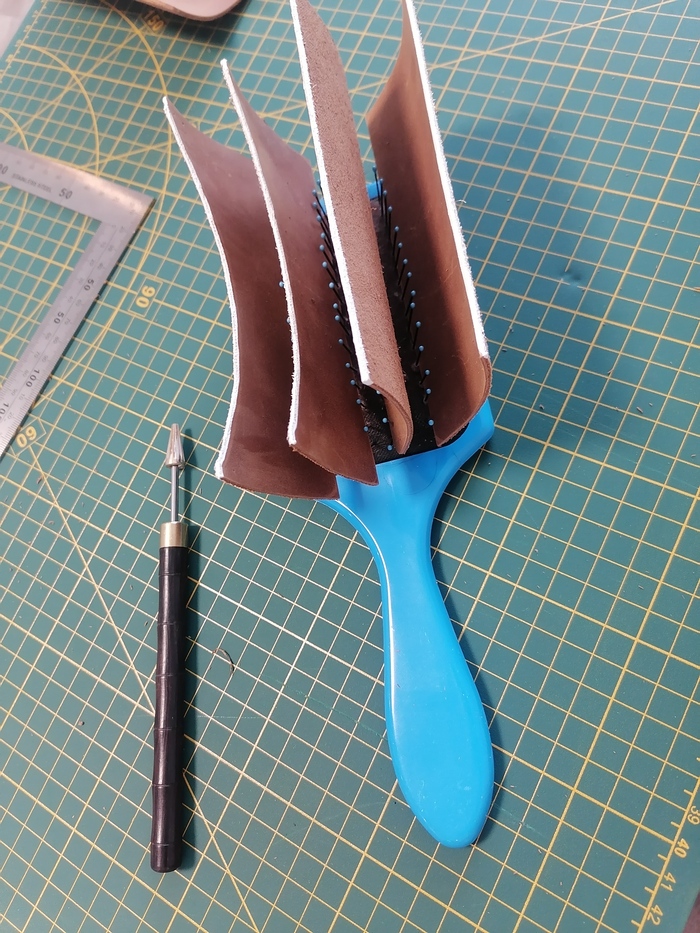 Немножко заполировал верхний слой кожи шерстяным носочком и приклеил части друг к другу. На одной из частей сделал отверстия для шва. На фотографии видно как полированная часть отличается.