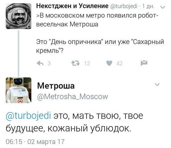 Однако в Твиттере быстро появился пародийный аккаунт, который принялся оскорблять пользователей и портить имидж робота-помощника.