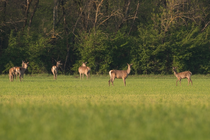 Несколько сот метров по утренней лесной дороге и я оказался на весеннем поле. Передо мной небольшое стадо оленей - пара вблизи и остальные поодаль, на краю поля.