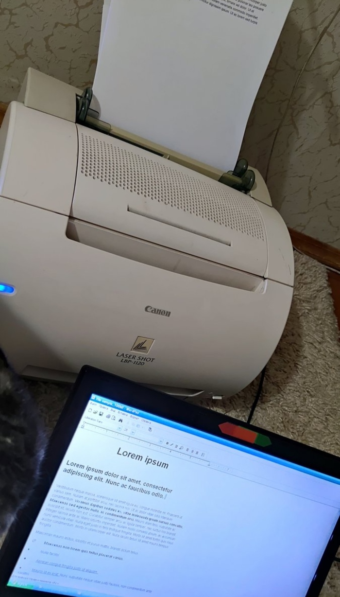 Был найдет отличный экземпляр: Canon LBP-1120, полностью рабочий, не скрипит, бумагу не жует, картридж в порядке и даже с краской! А главное цена 1000₽. Купил, взял старый ноут и установил на него Windows XP 32 bit - тот еще квест, но с четвертой попытки вин установилась, завелась и даже вайфай заработал. Далее накатил драйвер с оф сайта, воткнул флешку с word документом созданным в свежем офисе и о чудо, пошла печать. Без разводов и прочей ерунды, ровный текст на бумаге! Круто подумал я, для домашнего использования великолепно 🙌