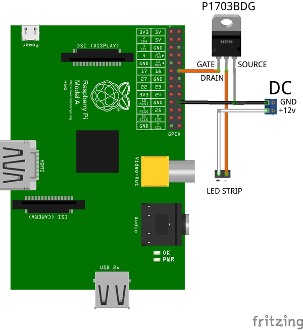 ● Исток транзистора (SOURCE) подключается на землю в Raspberry PI и к блоку питания.