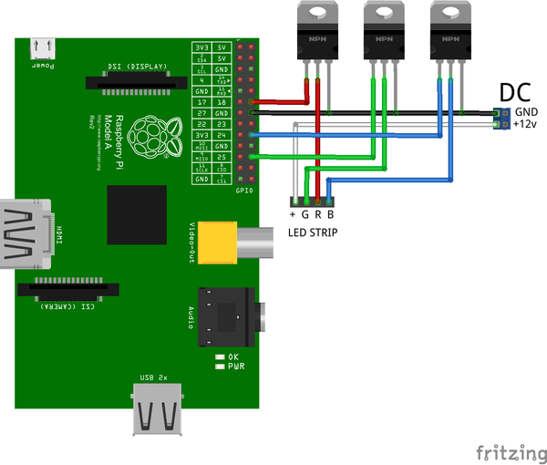 Управление яркостью ленты будет осуществляться с помощью широтно-импульсной модуляции (PWM). Грубо говоря, лента будет мигать с очень большой скоростью так, что будет казаться, будто она горит в половину мощности. Для этого потребуется драйвер pigpio.