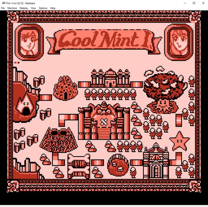 Игра называется Fire 'n Ice (под таким названием я скачал её с сайта с ромами для эмуляторов), она же Solomon's Key 2 или Solomon no Kagi 2: Coolmint Kyshutsu Sakusen. Игра представляет из себя головоломку: нам нужно с помощью кубиков льда, имеющихся на уровне или созданных игроком, погасить все огоньки на уровне, либо убить всех врагов, либо и то, и другое. Создавать кубики льда можно только в "клетках" по-диагонали уровнем ниже (момент создания ледяного кубика показан на картинке ниже), если рядом есть стенка или другой кубик - созданный кубик к ним прилипает, так можно строить мосты. Кубик, не прикреплённый с обоих сторон, можно толкнуть по горизонтали, либо он упадёт, если под ним ничего нет.
