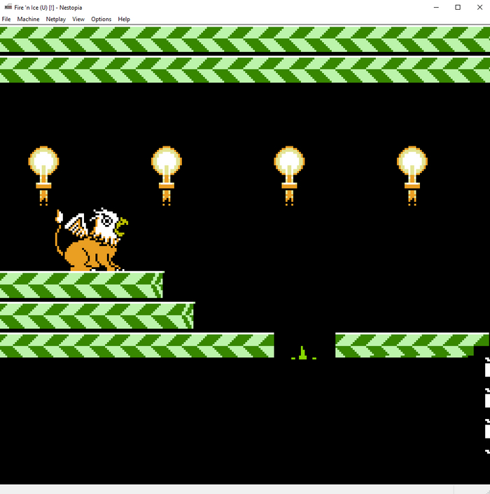 Выше на скрине место, до которого я дошёл сам по-честному, дальше использовал Game Genie. Нужно попасть на синюю платформу сверху, этому препятствует двигающаяся влево-вправо жёлтая платформа, минуя которую допрыгнуть нельзя, вращающаяся булава и серый элеватор, который стаскивает наверх, дополнительная проблема - попасть на элеватор вдоль серой стены нельзя, игра просто не даёт на него зайти, сделать это можно только стоя посередине платформы, на которой персонаж на скрине выше. Я тупо кучу раз подыхал тут, зависая на входе на элеватор и получая при этом булавой, либо сваливаясь в яму с элеватора, не успевая нажать прыжок. В целом, конечно, элеваторы - самая бесячая штука в игре.