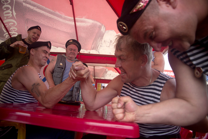 — День ВМФ в 2017 году. Моряки праздновали в кафе-палатке. Не буянили. Весёлые были, спокойные. Я фотографировал жизнь Прокопьевска, решил и их сфотографировать.