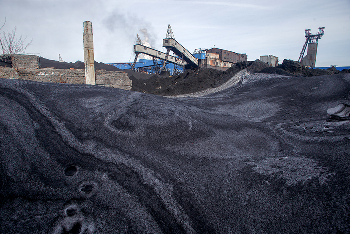 — Углеобогатительная фабрика в Прокопьевске. Снег тогда уже подтаял, но он чёрный от угольной пыли. В конце зимы, когда снег чистят, видна структура сугробов. Как слоёный пирог. Чёрные и белые слои чередуются. Белые — это когда снег шёл, а чёрные — это слои от «осадков», выпадающей угольной пыли.