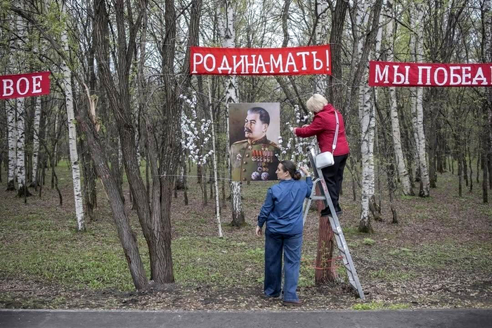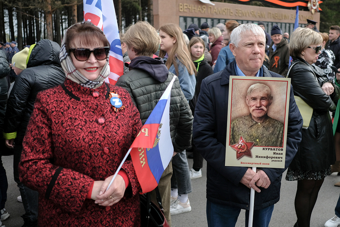 — Праздник 9 Мая в Прокопьевске в 2025 году. Ветер обдувает флаг с Путиным, и он принимает разные формы. Это НОДовцы вручили плакаты и знамёна своим детям и внукам.