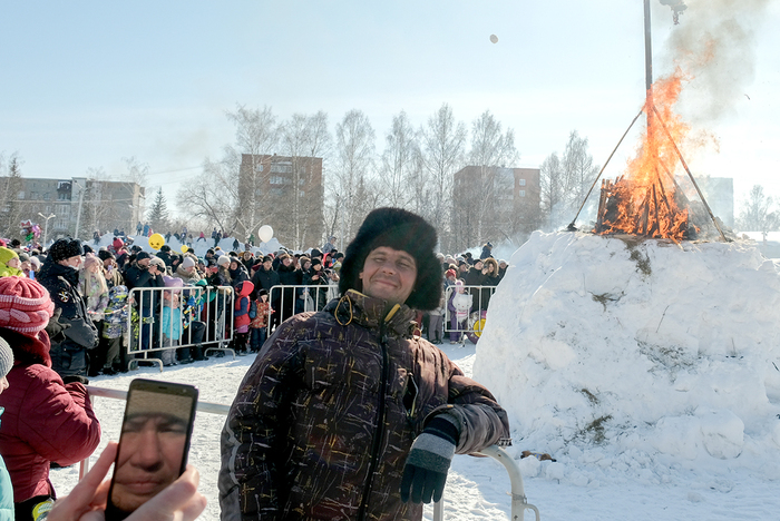 — Масленица, проводы русской зимы. Это в 2023 году снято. Вообще на Масленицу в Прокопьевске каждый год одно и то же. Праздник проводит горадминистрация. Каждый год те же самые конкурсы, те же самые костюмы. Но горожане приходят, им всё равно по кайфу. Единственное, чем они всегда недовольны, — в чучело Зимы кладут мало сена, и оно слишком быстро сгорает.