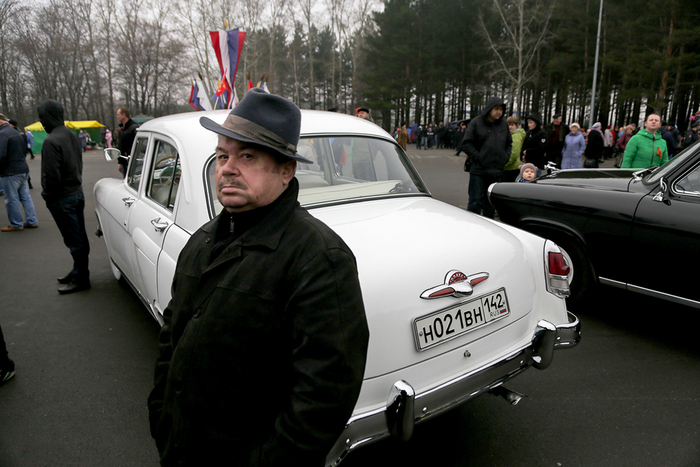 — 9 Мая в Прокопьевске несколько лет назад устраивали показ ретроавтомобилей. Владельцы пригнали свои раритетные авто, и горожане, пришедшие на праздник, рядом с ними фотографировались. Я просто мимо проходил и увидел этого мужчину в шляпе. Мужчина тоже в стиле ретро, как будто 70-е годы какие-нибудь.