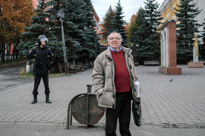 — Осень 2018 года. Что-то вроде контртеррористических учений проводили в Прокопьевском драмтеатре. Тренировались, будто в театре заложена бомба. Я тогда был штатным фотографом театра. В тот день нас попросили на час-полтора покинуть здание. Сотрудника полиции в шлеме, в полной экипировке, в Прокопьевске увидишь нечасто. Я пытался сфотографировать эту тренировку на контрасте с обычной жизнью. Суперкадров не вышло, но вот на этом снимке как-то по цветовой гамме всё сошлось. На переднем плане дяденька такой колоритный — как будто из советских годов.