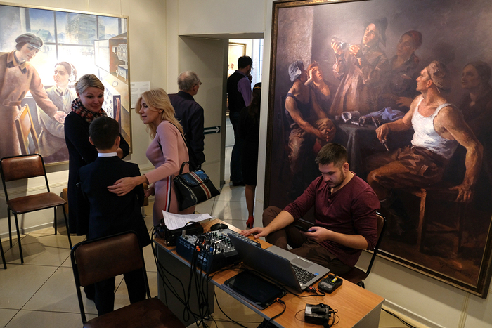 — Ноябрь 2018 года. В Прокопьевском культурно-выставочном центре «Вернисаж» была масштабная выставка. Привозили большие репродукции картин советских художников. На снимке — закулисье открытия экспозиции. Многие не верят, что это не постановочная фотография: картины и реальность рифмуются и по цветовой гамме, и по мизансцене. Но это действительно не постановка. Моя фотоистория про Прокопьевск — она в принципе не постановочная.