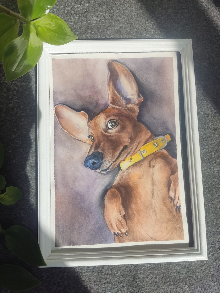 Таксочка с эелтым ошейником, была тут, но отдельно. Акварель, бумага, А4.