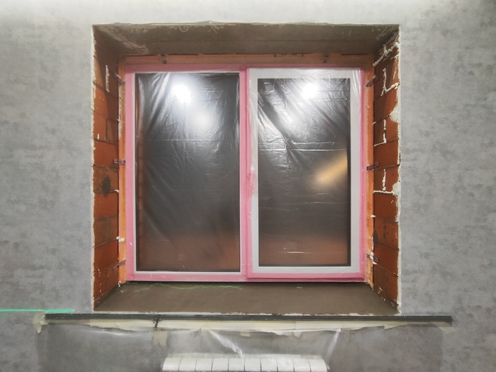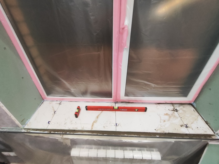 1) Итак первым этапом укрыл окна, закрыл радиатор, убрал лишний мусор, загрунтовал и залил основание под укладку подоконника: