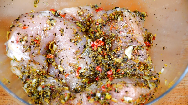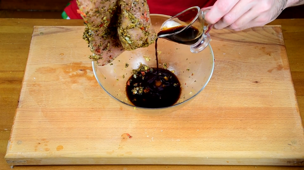 И теперь эту пасту хорошенько втираем в наш кусок индейки, тщательно, хорошенько, по всему периметру. После этого, на дно, в тару в которой будет мариноваться мясо зальём соевого соуса. На соус индейку, сверху тоже польём соусом (не сильно, но так, чтобы его слегка покрыть). Теперь отставляем мясо на несколько часов промариноваться, иногда переворачиваем, перемешиваем. Ждём...