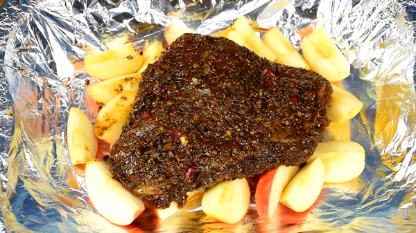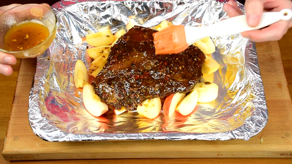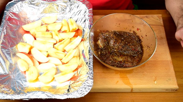 Индейка замариновалась и теперь готовим яблоки. Избавляемся от сердцевины и режем на произвольные дольки, как вам больше нравится. После этого застилаем противень фольгой и укладываем яблоки на него. На яблоки помещаем индейку.