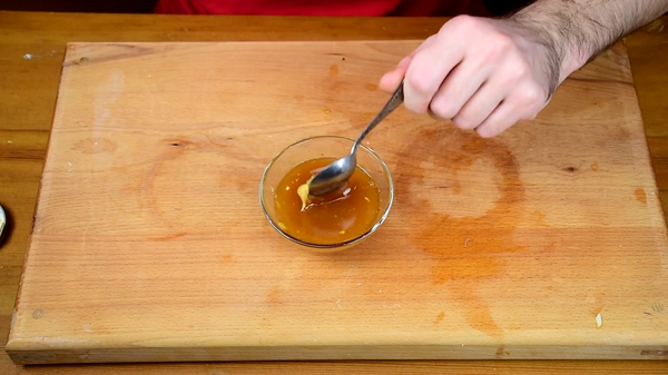 А теперь сделаем еще одну обмазку. Берем мед и в него добавляем горчицу, примерно в половинном объеме от количества мёда, по вкусу. Добавили, смешали, пробуем. Если вкусно, то ага, всё вышло -)