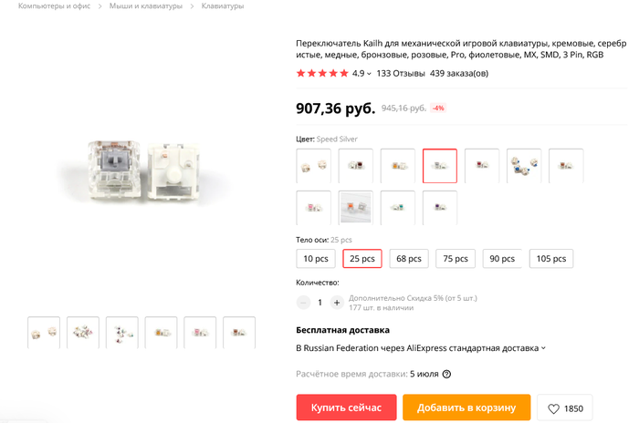 И даже здесь будут далеко не все типы свитчей, имеющихся на рынке: Aliaz, Zealio, Sakurio, Rosélio…я если честно и понятия не имею ни о чем из этого, а уж всякие Kailh Box цвета ‘Выжженного апельсина’ или ‘Нефрита’ уж и подавно, тут без 100 грамм и свидетелей секты механических клавиатур не разобраться точно.