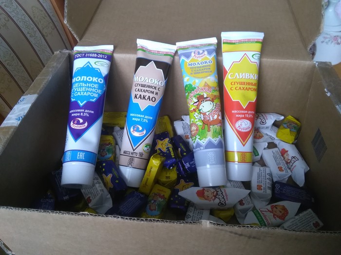 В подарке, кроме конфет, была "зубная паста" или "крем для рук" со вкусом сгущенки и сливок ))