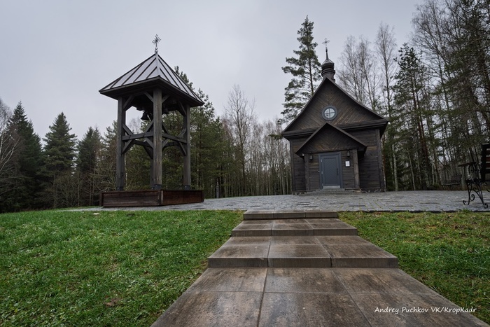Чуть поодаль стоит часовня. К ней ведет бетонная дорожка. Она стоит немного на возвышенности, и с неё виден весь комплекс. Откуда продолжали доноситься одинокие колокола. Она относительно недавно построенная, но очень удачно вписавшаяся в пейзаж мемориала.