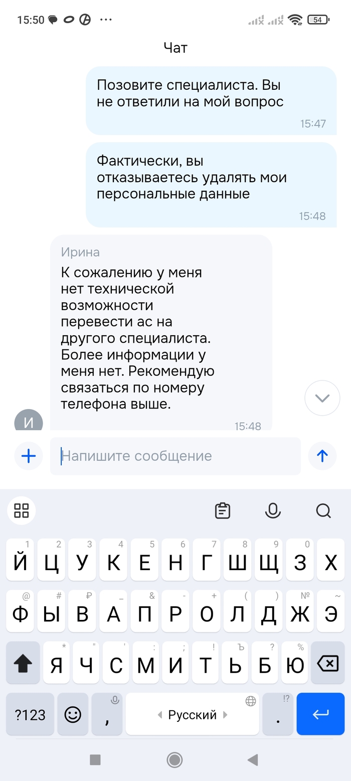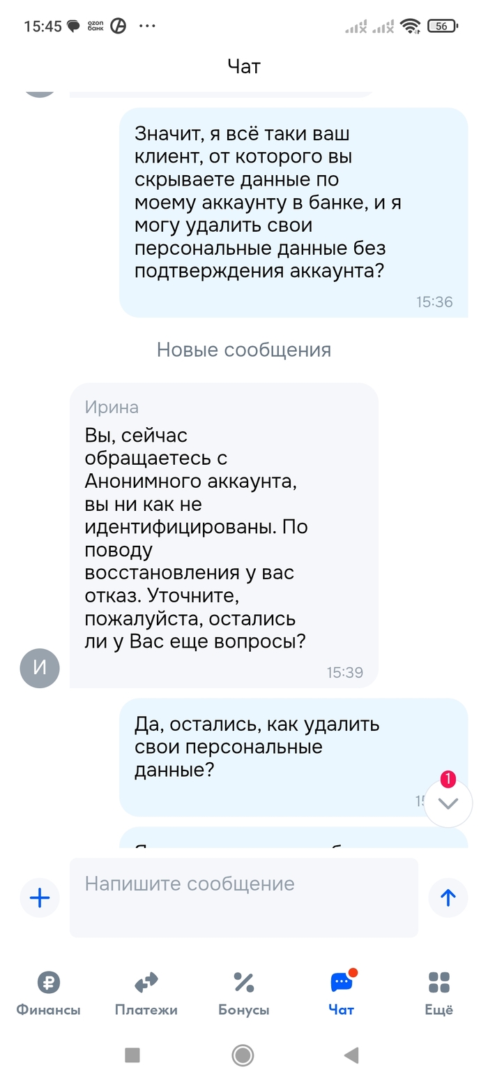 Озон банк отказывается удалять персональные данные