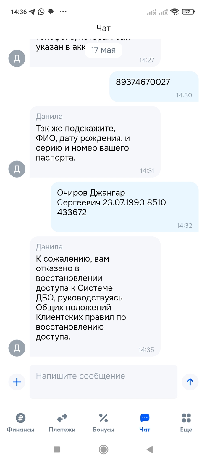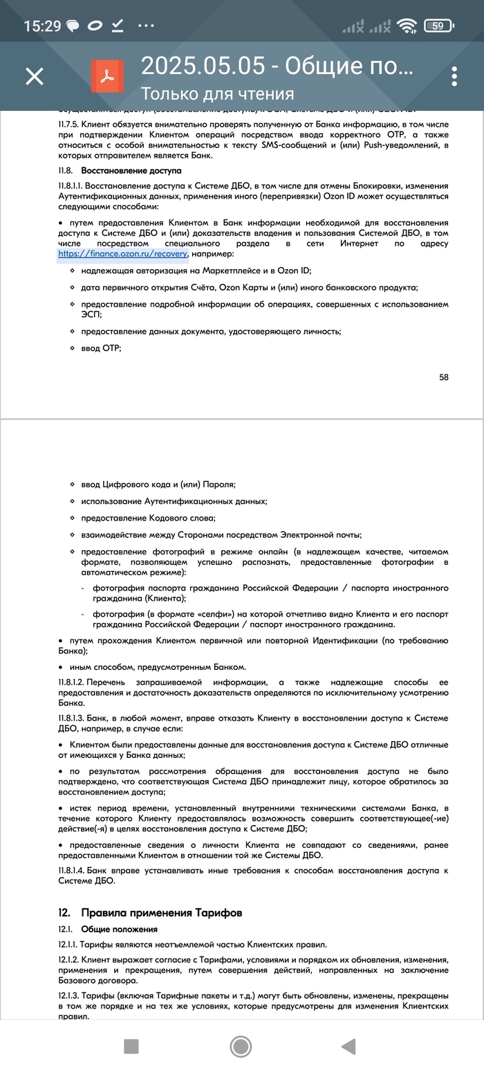 Будучи шопоголиком для упрощения покупок на одноименном маркетплейсе оформил карту озон банка т.е. стал клиентом банка. Две недели назад через чат поддержки удалил аккаунт в мобильном банке. Через неделю при попытке восстановить аккаунт поддержка уточняла мой ли номер телефон, привязанный к акк, заканчивающийся на 8290. Номер не мой. Начинается сюрреализм: в доступе к акк мне отказывают, физически они клиентов не принимают (нет офиса, чтобы придти к ним с паспортом), технически они подтвердить мою личность по телефону не могу (фотка с паспортом оказывается не работает). Тупик. В полицию сходил,написал заявление о утере аккаунта, не имея данных о ущербе, заявление о мошенничестве получит отказ. Тп озон банка ничего не может, со службой безопасности не связывает, мне в доступе к моим данным отказывает. Остается ждать, если на меня оформили рассрочку и идти в полицию. Надо писать жалобу ЦБ(что там пишут?). Конечно сам виноват, что сперли акк, надо было отозвать использование личных данных при удаление аккаунта, опять же самозапрет ставить, ну и выбирать безопасные банки