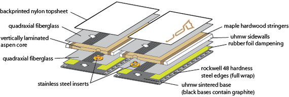А так, все как обычно, - сендвич по структуре. Только это не один, а как бы 2 скрепленных вместе (два мини-сноуборда)).
