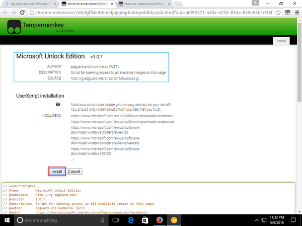 и в поле URL вставляем ссылку с кодом JavaScript'a: http://rg-adguard.net/dl/script/MS-unlock.js