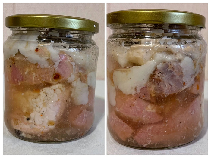 Первое, что лично меня удивило при открытии - жир прям белый, никогда такого еще не видел раньше. Но я не то чтобы обносил магазинные полки с тушенкой, мой опыт не такой богатый :)