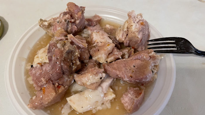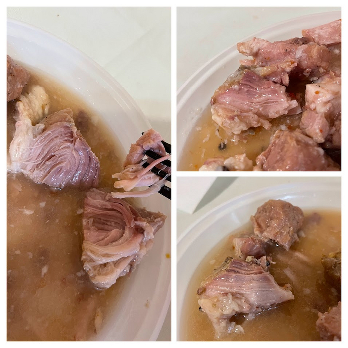 При этом, если отделить и отложить всякую мерзость в сторонку, то по вкусу вкусно, жуется пусть и не так мягко, но вполне себе ощущается мясо, может с макарохами или картошечкой зайдет лучше. При этом есть части мяса, которые мягче, есть те, которые жестче. Не знаю, с чем связано.