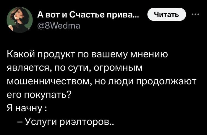 968 eckleer070brek Юмор для всех и каждого Продолжайте1 4 месяца назад Показать полностью 1 Юмор X (Twitter) Риэлтор Мошенничество Скриншот 105 39 6 1 Ещё 0