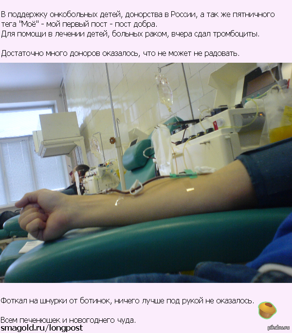 Тем двух моим подписчикам, не знаю кто вы, и зачем подписались, но спасибо вам. Однако, порадовать вас я мало чем могу, разве что поделиться результатами донорства за минувший год. На безвозмездной основе было сдано - 2 плазмы и 10 тромбоцитов за год. И только один раз мне сказали, что это для какого-то конкретного человека идет сбор тромбоцитов. Эта информация меня порадовала, так как обычно о том, что моя плазма/тромбоциты кому то были перелиты информации нет. (хотя иногда мелькают посты, что им часто приходят СМСки) ЗЫ: жаль второго почетного донора не дают, так бы была еще одна цель, которой можно достигнуть, а потому у меня, как у самурая, нет цели, есть только путь :)