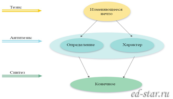 Изменяющееся нечто распадается на определение и характер. Определение - это качество, которое есть во в-себе-бытии нечто и сопротивляется переходу во что-то иное. Это качество, внутренне присущее самому нечто. Характер (внешняя определенность) - это то, что было на прежней стадии бытием-для-иного, то есть та сила, которая отрицает наше нечто и потому отбрасывается им, выпихивается, то, что не присуще имманентно, но изменяется в развитии. Однако и то и другое по-прежнему есть лишь качества, причем качества одного и того же изменяющегося нечто, присущие ему. Определение и характер, то, что противится изменениям и изменяется в развитии слились в одно целое - конечное. Ведь что такое конечное? Это то, что продолжает изменяться, но здесь и сейчас оно есть такое какое оно есть - ограниченное, с определенным набором качеств, то есть продолжающее изменяться, но неизменное в определенных рамках, в своих границах.
