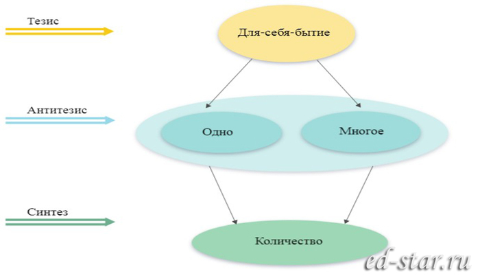 Таким образом, бесконечность распалась на дурную бесконечность и истинную бесконечность, обе из которых - лишь переходы от нечто к иному, которые теперь также оказались уравнены, ведь логически нет разницы, что брать за нечто, а что за иное. Со стороны первого нечто, остальное будет иным. Со стороны иного первое нечто становится иным, а само иное - нечто. В этой бесконечной череде одного и того же больше нет никаких различий, нет больше качеств в себе, качеств для иного, а есть одно большое и единое для-себя-бытие, в котором слились нечто и иное, дурная бесконечность и истинная бесконечность.