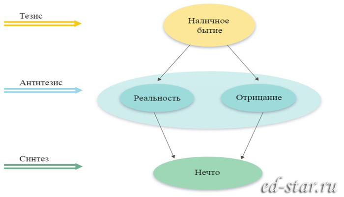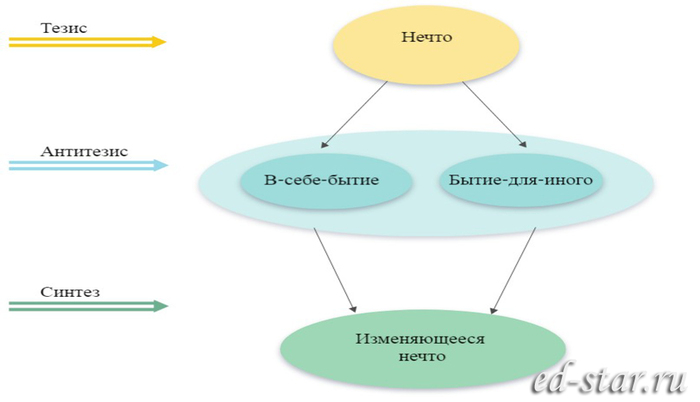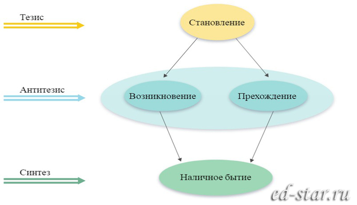Итак, всё начинается с бытия как с самой абстрактной и в некотором смысле фундаментальной категории. Бытие, будучи простой "естьностью" и в то же время ничем, не имея никаких определенностей, распадается на чистое бытие и чистое ничто, которые одновременно оказываются равными и неравными друг другу. Равными, потому что оба пустотны, не имеют никаких качеств. Неравными, потому что логически это всё-таки разные вещи - "есть" и "не есть". Так как бытие пустотно, оно никакое, то оно есть ничто. А так как ничто есть (хотя бы у нас в голове, как логическая операция, мы о нем говорим), значит оно бытие. И в то же время это всё-таки не одно и то же. Это противоречие оказывается разрешенным (снятым) в становлении, которое представляет собой такое единство бытия и ничто, в котором они взаимно переходят, взаимно исчезают, растворяются друг в друге.