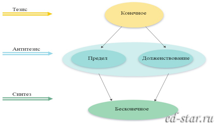У конечного есть предел, иначе оно не было бы конечным, и долженствование - та сила, которая побуждает к выходу за предел, к изменению. Однако предел бессмысленен без долженствования, а долженствование без предела. Они не самостоятельны и не могут существовать обособленно, одно без другого и потому сливаются в бесконечное. Почему в бесконечное? Потому что нечто, которое должно преодолеть свой предел, становится уже другим нечто, иным. Но теперь и это иное тоже должно преодолеть свой новый предел и так происходит до бесконечности. Конечное (логически) переходит в бесконечное. Бесконечный переход от нечто к иному есть дурная бесконечность. Но иное также переходит в свое иное, то есть в иное иного, а значит снова становится нечто.