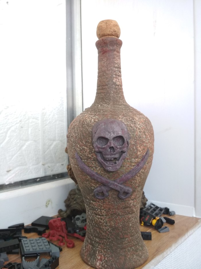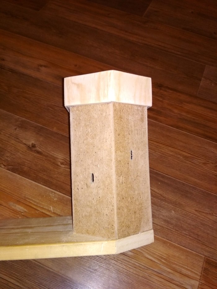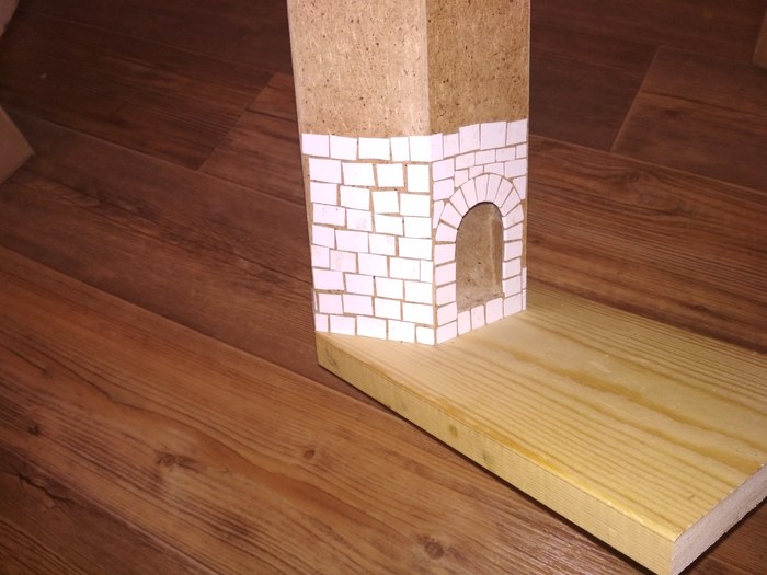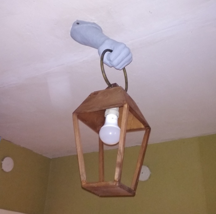Вот так оно выглядит в сборе, рука ещё просто в грунтовке, не определился как красить. Кольцо сделано из медной трубы, через неё идёт проводка. Фонарь деревянный, палки резал стуслом, щели закрывал опилками с пва.